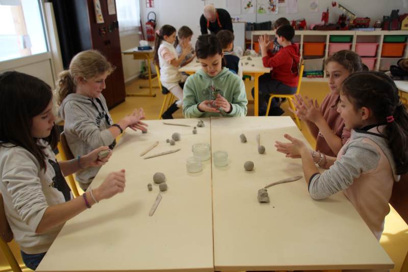 Les enfants ont été répartis par groupes afin de profiter pleinement de la rencontre avec l’artiste qui a retracé dans un premier temps son parcours et l’explication de son travail et de ses inspirations. Est venu ensuite le temps de relever les manches pour tout le monde ! Michaël Ezanno a pris le temps de faire découvrir l’argile aux enfants, ses propriétés et ses caractéristiques. Ils ont ainsi pu manipuler cette matière pouvant être sculptée et découvrir par eux même les différentes manières de l’appréhender. La partie « pratique » a été concluante avec le modelage d’animaux en argile. Le groupe des GS-CP se sont attelés à la fabrication de dinosaures, les CE ont élaboré des chats et enfin les CM se sont appliqué à réaliser des éléphants. Sacré challenge pour nos écoliers qui auront le plaisir de ramener chez eux leurs créations artistiques après le temps de séchage réglementaire bien sûr !