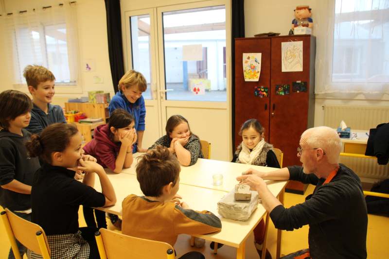 Les enfants ont été répartis par groupes afin de profiter pleinement de la rencontre avec l’artiste qui a retracé dans un premier temps son parcours et l’explication de son travail et de ses inspirations. Est venu ensuite le temps de relever les manches pour tout le monde ! Michaël Ezanno a pris le temps de faire découvrir l’argile aux enfants, ses propriétés et ses caractéristiques. Ils ont ainsi pu manipuler cette matière pouvant être sculptée et découvrir par eux même les différentes manières de l’appréhender. La partie « pratique » a été concluante avec le modelage d’animaux en argile. Le groupe des GS-CP se sont attelés à la fabrication de dinosaures, les CE ont élaboré des chats et enfin les CM se sont appliqué à réaliser des éléphants. Sacré challenge pour nos écoliers qui auront le plaisir de ramener chez eux leurs créations artistiques après le temps de séchage réglementaire bien sûr !