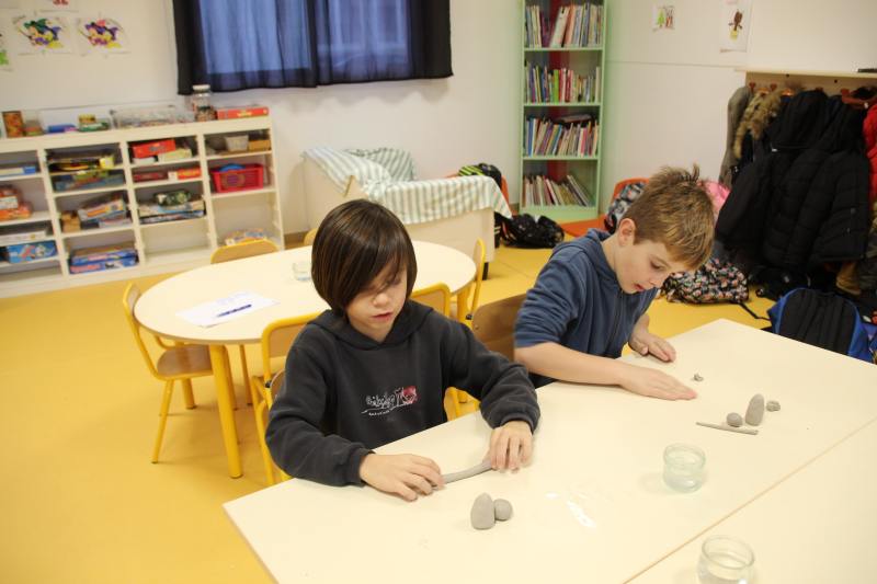 Les enfants ont été répartis par groupes afin de profiter pleinement de la rencontre avec l’artiste qui a retracé dans un premier temps son parcours et l’explication de son travail et de ses inspirations. Est venu ensuite le temps de relever les manches pour tout le monde ! Michaël Ezanno a pris le temps de faire découvrir l’argile aux enfants, ses propriétés et ses caractéristiques. Ils ont ainsi pu manipuler cette matière pouvant être sculptée et découvrir par eux même les différentes manières de l’appréhender. La partie « pratique » a été concluante avec le modelage d’animaux en argile. Le groupe des GS-CP se sont attelés à la fabrication de dinosaures, les CE ont élaboré des chats et enfin les CM se sont appliqué à réaliser des éléphants. Sacré challenge pour nos écoliers qui auront le plaisir de ramener chez eux leurs créations artistiques après le temps de séchage réglementaire bien sûr !