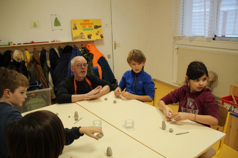 Les enfants ont été répartis par groupes afin de profiter pleinement de la rencontre avec l’artiste qui a retracé dans un premier temps son parcours et l’explication de son travail et de ses inspirations. Est venu ensuite le temps de relever les manches pour tout le monde ! Michaël Ezanno a pris le temps de faire découvrir l’argile aux enfants, ses propriétés et ses caractéristiques. Ils ont ainsi pu manipuler cette matière pouvant être sculptée et découvrir par eux même les différentes manières de l’appréhender. La partie « pratique » a été concluante avec le modelage d’animaux en argile. Le groupe des GS-CP se sont attelés à la fabrication de dinosaures, les CE ont élaboré des chats et enfin les CM se sont appliqué à réaliser des éléphants. Sacré challenge pour nos écoliers qui auront le plaisir de ramener chez eux leurs créations artistiques après le temps de séchage réglementaire bien sûr !