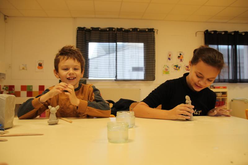 Les enfants ont été répartis par groupes afin de profiter pleinement de la rencontre avec l’artiste qui a retracé dans un premier temps son parcours et l’explication de son travail et de ses inspirations. Est venu ensuite le temps de relever les manches pour tout le monde ! Michaël Ezanno a pris le temps de faire découvrir l’argile aux enfants, ses propriétés et ses caractéristiques. Ils ont ainsi pu manipuler cette matière pouvant être sculptée et découvrir par eux même les différentes manières de l’appréhender. La partie « pratique » a été concluante avec le modelage d’animaux en argile. Le groupe des GS-CP se sont attelés à la fabrication de dinosaures, les CE ont élaboré des chats et enfin les CM se sont appliqué à réaliser des éléphants. Sacré challenge pour nos écoliers qui auront le plaisir de ramener chez eux leurs créations artistiques après le temps de séchage réglementaire bien sûr !