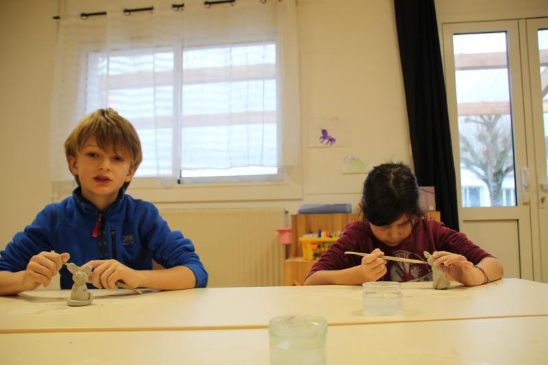 Les enfants ont été répartis par groupes afin de profiter pleinement de la rencontre avec l’artiste qui a retracé dans un premier temps son parcours et l’explication de son travail et de ses inspirations. Est venu ensuite le temps de relever les manches pour tout le monde ! Michaël Ezanno a pris le temps de faire découvrir l’argile aux enfants, ses propriétés et ses caractéristiques. Ils ont ainsi pu manipuler cette matière pouvant être sculptée et découvrir par eux même les différentes manières de l’appréhender. La partie « pratique » a été concluante avec le modelage d’animaux en argile. Le groupe des GS-CP se sont attelés à la fabrication de dinosaures, les CE ont élaboré des chats et enfin les CM se sont appliqué à réaliser des éléphants. Sacré challenge pour nos écoliers qui auront le plaisir de ramener chez eux leurs créations artistiques après le temps de séchage réglementaire bien sûr !