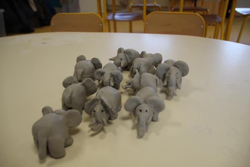 Les enfants ont été répartis par groupes afin de profiter pleinement de la rencontre avec l’artiste qui a retracé dans un premier temps son parcours et l’explication de son travail et de ses inspirations. Est venu ensuite le temps de relever les manches pour tout le monde ! Michaël Ezanno a pris le temps de faire découvrir l’argile aux enfants, ses propriétés et ses caractéristiques. Ils ont ainsi pu manipuler cette matière pouvant être sculptée et découvrir par eux même les différentes manières de l’appréhender. La partie « pratique » a été concluante avec le modelage d’animaux en argile. Le groupe des GS-CP se sont attelés à la fabrication de dinosaures, les CE ont élaboré des chats et enfin les CM se sont appliqué à réaliser des éléphants. Sacré challenge pour nos écoliers qui auront le plaisir de ramener chez eux leurs créations artistiques après le temps de séchage réglementaire bien sûr !