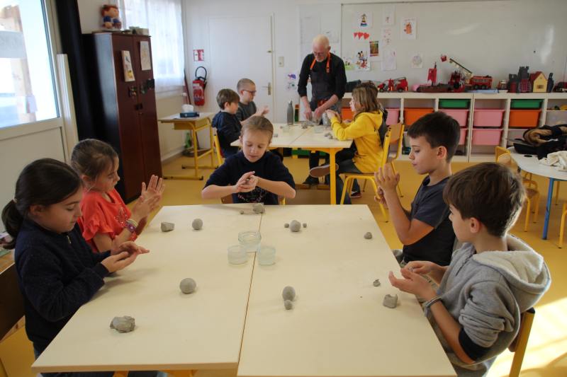 Les enfants ont été répartis par groupes afin de profiter pleinement de la rencontre avec l’artiste qui a retracé dans un premier temps son parcours et l’explication de son travail et de ses inspirations. Est venu ensuite le temps de relever les manches pour tout le monde ! Michaël Ezanno a pris le temps de faire découvrir l’argile aux enfants, ses propriétés et ses caractéristiques. Ils ont ainsi pu manipuler cette matière pouvant être sculptée et découvrir par eux même les différentes manières de l’appréhender. La partie « pratique » a été concluante avec le modelage d’animaux en argile. Le groupe des GS-CP se sont attelés à la fabrication de dinosaures, les CE ont élaboré des chats et enfin les CM se sont appliqué à réaliser des éléphants. Sacré challenge pour nos écoliers qui auront le plaisir de ramener chez eux leurs créations artistiques après le temps de séchage réglementaire bien sûr !