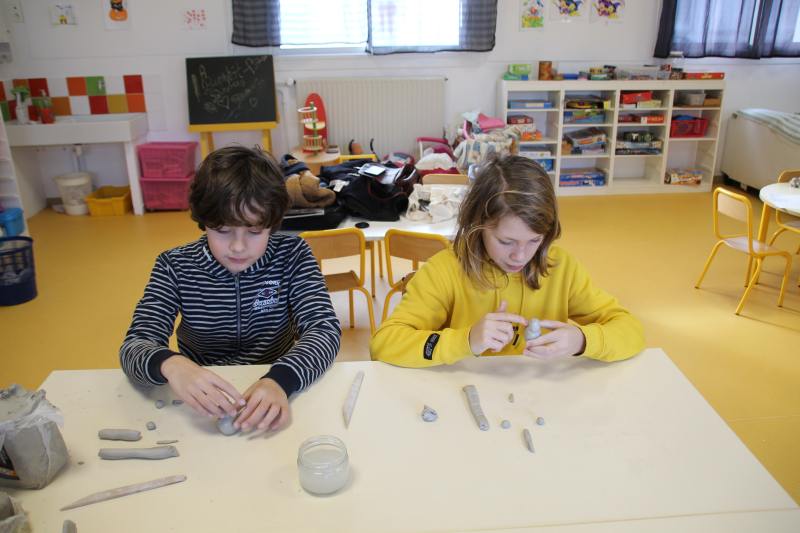 Les enfants ont été répartis par groupes afin de profiter pleinement de la rencontre avec l’artiste qui a retracé dans un premier temps son parcours et l’explication de son travail et de ses inspirations. Est venu ensuite le temps de relever les manches pour tout le monde ! Michaël Ezanno a pris le temps de faire découvrir l’argile aux enfants, ses propriétés et ses caractéristiques. Ils ont ainsi pu manipuler cette matière pouvant être sculptée et découvrir par eux même les différentes manières de l’appréhender. La partie « pratique » a été concluante avec le modelage d’animaux en argile. Le groupe des GS-CP se sont attelés à la fabrication de dinosaures, les CE ont élaboré des chats et enfin les CM se sont appliqué à réaliser des éléphants. Sacré challenge pour nos écoliers qui auront le plaisir de ramener chez eux leurs créations artistiques après le temps de séchage réglementaire bien sûr !