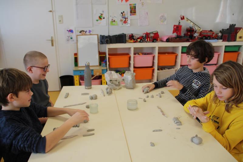 Les enfants ont été répartis par groupes afin de profiter pleinement de la rencontre avec l’artiste qui a retracé dans un premier temps son parcours et l’explication de son travail et de ses inspirations. Est venu ensuite le temps de relever les manches pour tout le monde ! Michaël Ezanno a pris le temps de faire découvrir l’argile aux enfants, ses propriétés et ses caractéristiques. Ils ont ainsi pu manipuler cette matière pouvant être sculptée et découvrir par eux même les différentes manières de l’appréhender. La partie « pratique » a été concluante avec le modelage d’animaux en argile. Le groupe des GS-CP se sont attelés à la fabrication de dinosaures, les CE ont élaboré des chats et enfin les CM se sont appliqué à réaliser des éléphants. Sacré challenge pour nos écoliers qui auront le plaisir de ramener chez eux leurs créations artistiques après le temps de séchage réglementaire bien sûr !