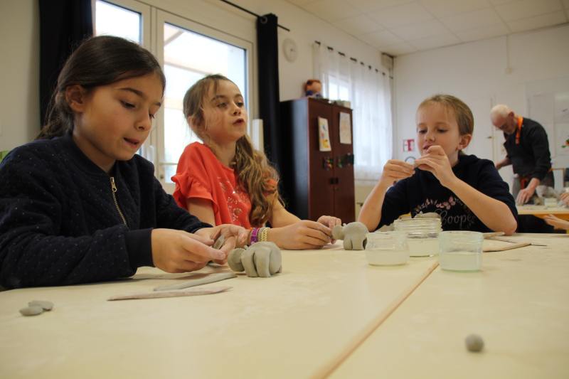 Les enfants ont été répartis par groupes afin de profiter pleinement de la rencontre avec l’artiste qui a retracé dans un premier temps son parcours et l’explication de son travail et de ses inspirations. Est venu ensuite le temps de relever les manches pour tout le monde ! Michaël Ezanno a pris le temps de faire découvrir l’argile aux enfants, ses propriétés et ses caractéristiques. Ils ont ainsi pu manipuler cette matière pouvant être sculptée et découvrir par eux même les différentes manières de l’appréhender. La partie « pratique » a été concluante avec le modelage d’animaux en argile. Le groupe des GS-CP se sont attelés à la fabrication de dinosaures, les CE ont élaboré des chats et enfin les CM se sont appliqué à réaliser des éléphants. Sacré challenge pour nos écoliers qui auront le plaisir de ramener chez eux leurs créations artistiques après le temps de séchage réglementaire bien sûr !