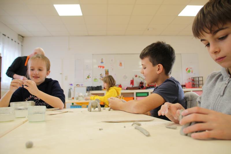 Les enfants ont été répartis par groupes afin de profiter pleinement de la rencontre avec l’artiste qui a retracé dans un premier temps son parcours et l’explication de son travail et de ses inspirations. Est venu ensuite le temps de relever les manches pour tout le monde ! Michaël Ezanno a pris le temps de faire découvrir l’argile aux enfants, ses propriétés et ses caractéristiques. Ils ont ainsi pu manipuler cette matière pouvant être sculptée et découvrir par eux même les différentes manières de l’appréhender. La partie « pratique » a été concluante avec le modelage d’animaux en argile. Le groupe des GS-CP se sont attelés à la fabrication de dinosaures, les CE ont élaboré des chats et enfin les CM se sont appliqué à réaliser des éléphants. Sacré challenge pour nos écoliers qui auront le plaisir de ramener chez eux leurs créations artistiques après le temps de séchage réglementaire bien sûr !