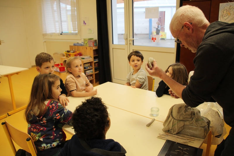 Les enfants ont été répartis par groupes afin de profiter pleinement de la rencontre avec l’artiste qui a retracé dans un premier temps son parcours et l’explication de son travail et de ses inspirations. Est venu ensuite le temps de relever les manches pour tout le monde ! Michaël Ezanno a pris le temps de faire découvrir l’argile aux enfants, ses propriétés et ses caractéristiques. Ils ont ainsi pu manipuler cette matière pouvant être sculptée et découvrir par eux même les différentes manières de l’appréhender. La partie « pratique » a été concluante avec le modelage d’animaux en argile. Le groupe des GS-CP se sont attelés à la fabrication de dinosaures, les CE ont élaboré des chats et enfin les CM se sont appliqué à réaliser des éléphants. Sacré challenge pour nos écoliers qui auront le plaisir de ramener chez eux leurs créations artistiques après le temps de séchage réglementaire bien sûr !