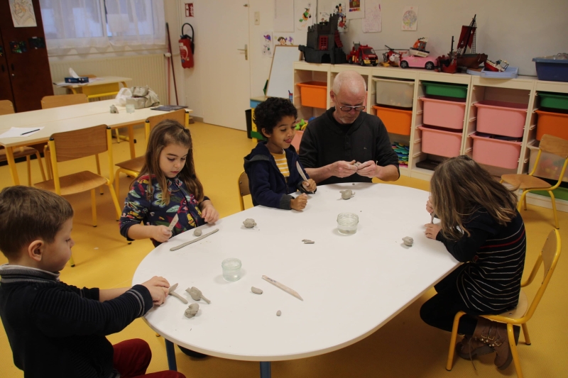 Les enfants ont été répartis par groupes afin de profiter pleinement de la rencontre avec l’artiste qui a retracé dans un premier temps son parcours et l’explication de son travail et de ses inspirations. Est venu ensuite le temps de relever les manches pour tout le monde ! Michaël Ezanno a pris le temps de faire découvrir l’argile aux enfants, ses propriétés et ses caractéristiques. Ils ont ainsi pu manipuler cette matière pouvant être sculptée et découvrir par eux même les différentes manières de l’appréhender. La partie « pratique » a été concluante avec le modelage d’animaux en argile. Le groupe des GS-CP se sont attelés à la fabrication de dinosaures, les CE ont élaboré des chats et enfin les CM se sont appliqué à réaliser des éléphants. Sacré challenge pour nos écoliers qui auront le plaisir de ramener chez eux leurs créations artistiques après le temps de séchage réglementaire bien sûr !