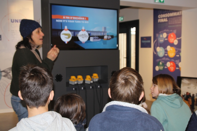 À l’extrémité du port de pêche, au bout de la criée, Escale Pêche accueille les petits et les grands à la découverte de la pêche en mer et de l’activité portuaire de Saint Gilles Croix de Vie. Ce centre d’interprétation propose à la fois du contenu informatif sur l’histoire de notre port de pêche, une exposition « Le voyage du poisson de l’océan à l’assiette » mais également du contenus ludique et intéractif avec des jeux pour découvrir les différentes espèces de poissons, les techniques de pêche en mer ou encore les ventes aux enchères à la criée. Nos CM ont écouté, testé et se sont entraînés au tri, à la pesée des poissons et à la vente aux enchères sur les écrans numériques à disposition.