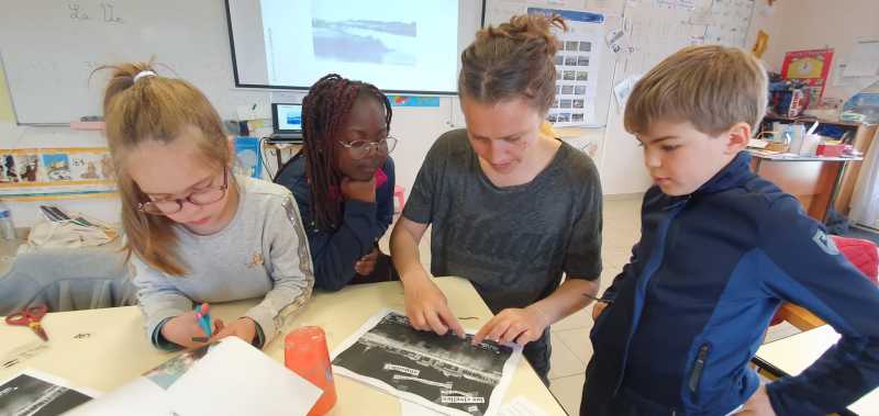 Vendredi 14 avril, dernière séance avec les artistes pour la création des cartes postales ! À partir des photos sélectionnées la dernière fois, il est l’heure de travailler sur le négatif des photos avec Pierre, photographe. Ils sont placés au soleil sur la feuille magique. C’est rigolo, le soleil fait bronzer la feuille et révèle les photos en bleu. On appelle ça le cyanotype ! Ensuite, il est l’heure de les rincer avec de l’eau et du vinaigre. Camille a beaucoup aidé nos élèves à mettre en valeur les photos qui ont été prises. Son travail de designer est très important pour mettre en valeur le patrimoine ! Grâce aux deux artistes venus dans la classe, les cartes postales créées pourront avoir leur exposition en juin. Affaire à suivre …