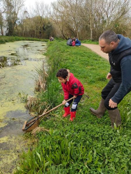 Mardi 28 mars, au cours de la deuxième séance, un diaporama a été présenté aux enfants pour nommer toutes les petites bêtes pouvant peupler les milieux humides. Cette présentation en avance n’a pas été inutile puisque c’est avec connaissance et détermination que les élèves ont enfilé leurs bottes pour la sortie pêche. Le long de la mare, ils ont ainsi observé les insectes, ramassé et capturé les organismes qui s’y trouvaient. En regagnant la classe, les comptes sont dressés : 16 espèces différentes ont été retrouvées. De véritables explorateurs !