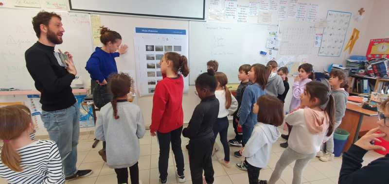 Dans le cadre de la politique culturelle du Pays de Saint Gilles Croix de Vie, un Contrat Local d’Education Artistique (C.L.E.A) a été signés entre la communauté de communes et l’État. Par le biais d’un appel à projet, une résidence d’artistes s’est installée sur le territoire pour développer et exposer des projets dans le champ des arts plastiques. C’est dans cette dynamique que deux artistes se sont rendus dans la classe des CE afin d’y présenter la mission de cartographie sensible sur l’eau qu’ils mènent dans notre commune.