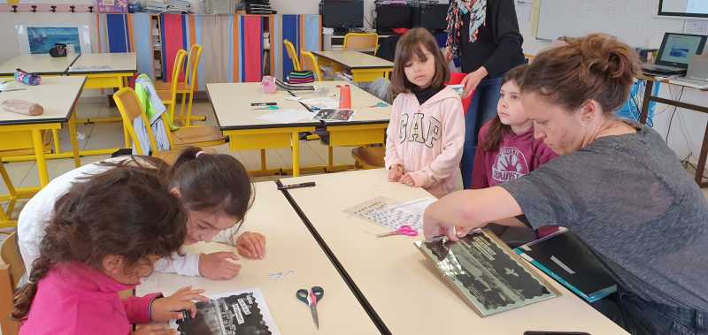 Vendredi 14 avril, dernière séance avec les artistes pour la création des cartes postales ! À partir des photos sélectionnées la dernière fois, il est l’heure de travailler sur le négatif des photos avec Pierre, photographe. Ils sont placés au soleil sur la feuille magique. C’est rigolo, le soleil fait bronzer la feuille et révèle les photos en bleu. On appelle ça le cyanotype ! Ensuite, il est l’heure de les rincer avec de l’eau et du vinaigre. Camille a beaucoup aidé nos élèves à mettre en valeur les photos qui ont été prises. Son travail de designer est très important pour mettre en valeur le patrimoine ! Grâce aux deux artistes venus dans la classe, les cartes postales créées pourront avoir leur exposition en juin. Affaire à suivre …