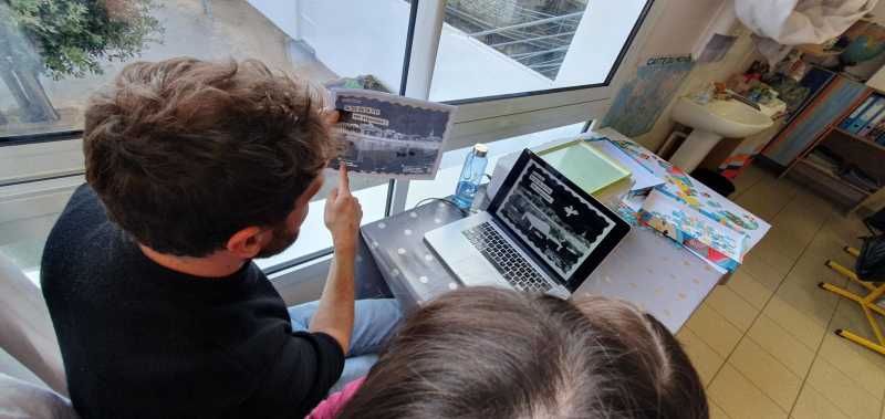 Vendredi 14 avril, dernière séance avec les artistes pour la création des cartes postales ! À partir des photos sélectionnées la dernière fois, il est l’heure de travailler sur le négatif des photos avec Pierre, photographe. Ils sont placés au soleil sur la feuille magique. C’est rigolo, le soleil fait bronzer la feuille et révèle les photos en bleu. On appelle ça le cyanotype ! Ensuite, il est l’heure de les rincer avec de l’eau et du vinaigre. Camille a beaucoup aidé nos élèves à mettre en valeur les photos qui ont été prises. Son travail de designer est très important pour mettre en valeur le patrimoine ! Grâce aux deux artistes venus dans la classe, les cartes postales créées pourront avoir leur exposition en juin. Affaire à suivre …