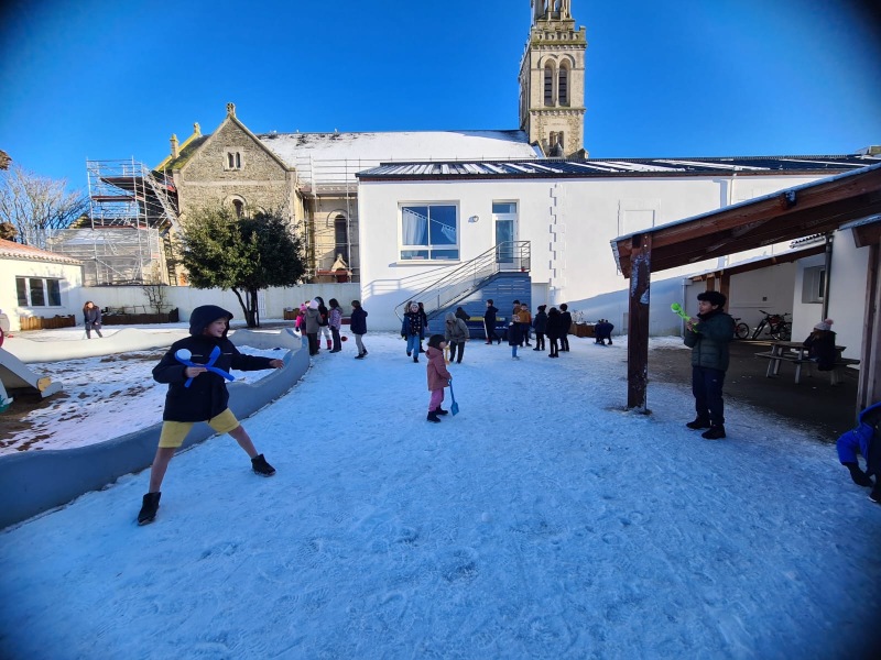 Début janvier, Dame Nature nous a offert deux jours de neige pour le bonheur de tous ! L’école Sainte-Croix s’est réveillée sous un magnifique manteau blanc ! Les élèves ont savouré ce moment rare en Vendée : batailles de boules de neige, rires dans la cour et balades jusqu’à la plage de Boisvinet pour les plus grands. Tous ont profité de ce décor enchanteur qui a transformé, le temps d’une journée, leur quotidien en vraie carte postale d’hiver.