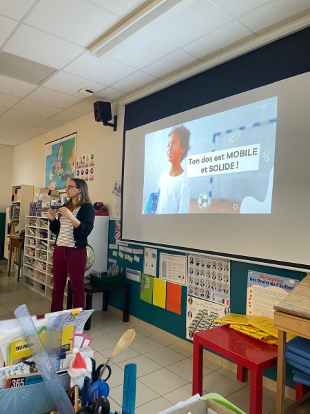 Quelques jours plus tôt, une kinésithérapeute, Agnès Bellard, nous a parlé de l’importance de bien préserver son dos. Après des explications sur l’anatomie du dos et des différentes vertèbres, elle a montré comment bien porter son cartable, adopter une posture adéquate et détecter les signes d’une scoliose. Les élèves ont également participé à des exercices pratiques, les aidant à comprendre que de simples gestes quotidiens peuvent préserver leur santé pour longtemps.